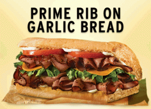 Now they have birthed the new Prime Rib on Garlic Bread, Prime Rib & Blue and Chipotle Prime Rib subs that bring Quiznos’ tally of prime rib sandwiches to a whopping eight. These new prime ribs subs will be permanent menu additions in the Quiznos line of signature subs, alongside current Quiznos prime rib favorites: Prime Rib Mushroom & Swiss, Prime Rib & Peppercorn, Double Cheese Cheesesteak, Steakhouse Prime Rib Dip and Bourbon Grille Steak. Oh mylanta!